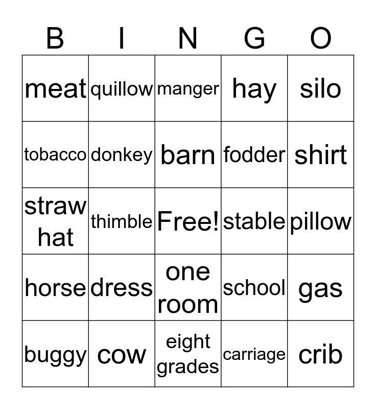 This bingo card has a free space and 62 words: chicken, cow, sheep, horse, mule, goat, donkey, corn, fodder, silage, hay, bale, tobacco, milk, eggs, meat, crib, silo, silo bag, barn, stable, manger, buggy, carriage, wagon, scooter, tractor, forklift, gas, diesel, propane, kerosene, solar electricity, quilt, pillow, quillow, needle, thread, thimble, bonnet, straw hat, pants, dress, coat, shirt, school, fence, outhouse, pump, backstop, one room, eight grades, English, one teacher, scholars, Amish, Lancaster, Bird-in-Hand, Intercourse, farm, puppy and mule.