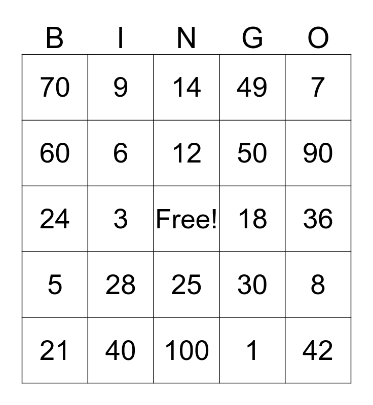 This bingo card has a free space and 32 words: 1, 2, 3, 4, 5, 6, 7, 8, 9, 10, 12, 14, 15, 16, 18, 20, 21, 24, 25, 28, 30, 35, 36, 40, 42, 49, 50, 60, 70, 100, 80 and 90.