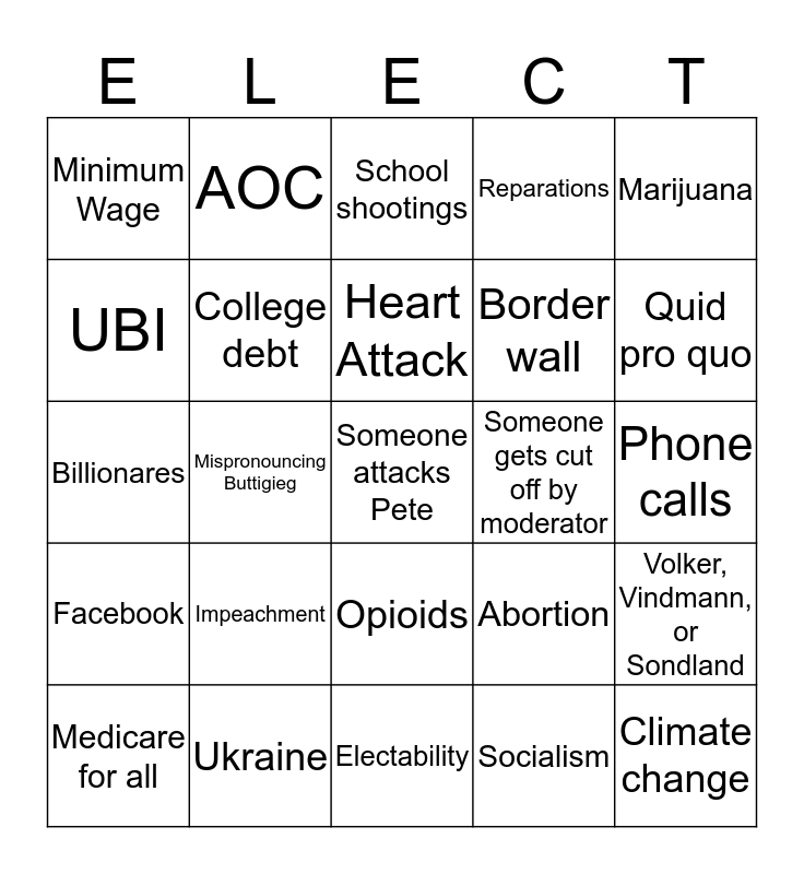 This bingo card has a free space and 24 words: Impeachment, Ukraine, Heart Attack, Medicare for all, Marijuana, Minimum Wage, UBI, AOC, Someone gets cut off by moderator, Opioids, Border wall, Billionares, Abortion, Volker, Vindmann, or Sondland, College debt, Socialism, Phone calls, School shootings, Quid pro quo, Mispronouncing Buttigieg, Climate change, Facebook, Reparations and Electability.