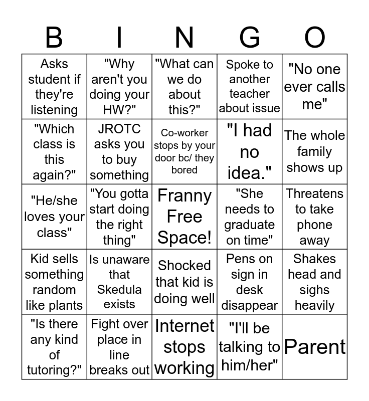 This bingo card has a free space and 24 words: Is unaware that Skedula exists, Fight over place in line breaks out, Co-worker stops by your door bc/ they bored, "Is there any kind of tutoring?", "No one ever calls me", Asks student if they're listening, "Which class is this again?", "Why aren't you doing your HW?", "She needs to graduate on time", Shocked that kid is doing well, "I had no idea.", "He/she loves your class", Pens on sign in desk disappear, Shakes head and sighs heavily, JROTC asks you to buy something, "I'll be talking to him/her", Threatens to take phone away, "What can we do about this?", The whole family shows up, "You gotta start doing the right thing", Parent, Kid sells something random like plants, Spoke to another teacher about issue and Internet stops working.