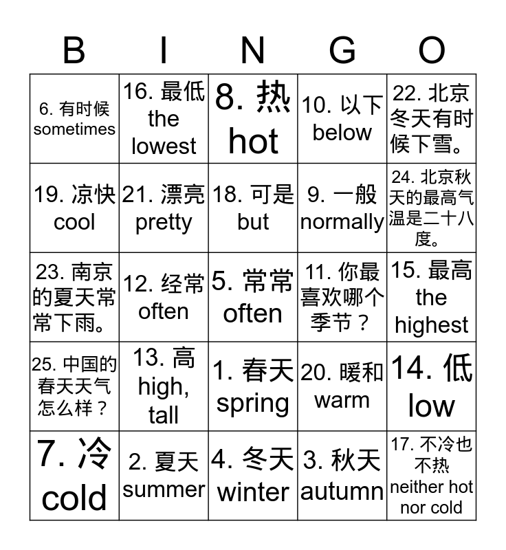 This bingo card has a free space and 24 words: 13. 高 high, tall, 2. 夏天 summer, 18. 可是 but, 7. 冷 cold, 22. 北京冬天有时候下雪。, 6. 有时候 sometimes, 19. 凉快 cool, 16. 最低 the lowest, 11. 你最喜欢哪个季节?, 1. 春天 spring, 9. 一般 normally, 23. 南京的夏天常常下雨。, 20. 暖和 warm, 14. 低 low, 21. 漂亮 pretty, 3. 秋天 autumn, 15. 最高 the highest, 8. 热 hot, 24. 北京秋天的最高气温是二十八度。, 12. 经常 often, 17. 不冷也不热 neither hot nor cold, 25. 中国的春天天气怎么样?, 10. 以下 below and 4. 冬天 winter.