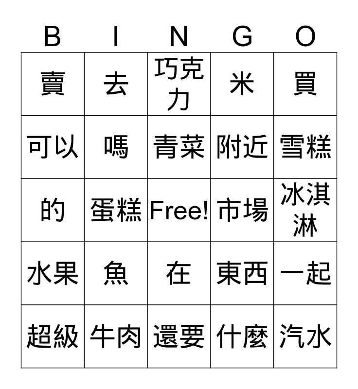 This bingo card has a free space and 24 words: 魚, 牛肉, 青菜, 超級, 買, 賣, 可以, 去, 市場, 在, 附近, 的, 東西, 一起, 嗎, 什麼, 冰淇淋, 巧克力, 雪糕, 蛋糕, 汽水, 水果, 米 and 還要.