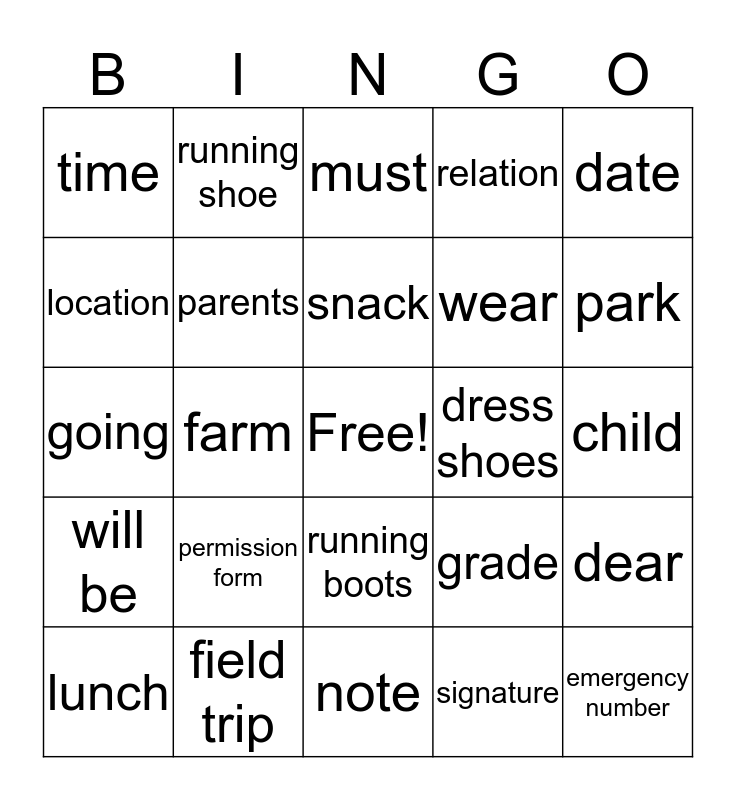 This bingo card has a free space and 24 words: permission form, field trip, snack, lunch, date, time, location, running shoe, dress shoes, running boots, wear, going, grade, dear, parents, signature, child, must, park, farm, emergency number, will be, relation and note.