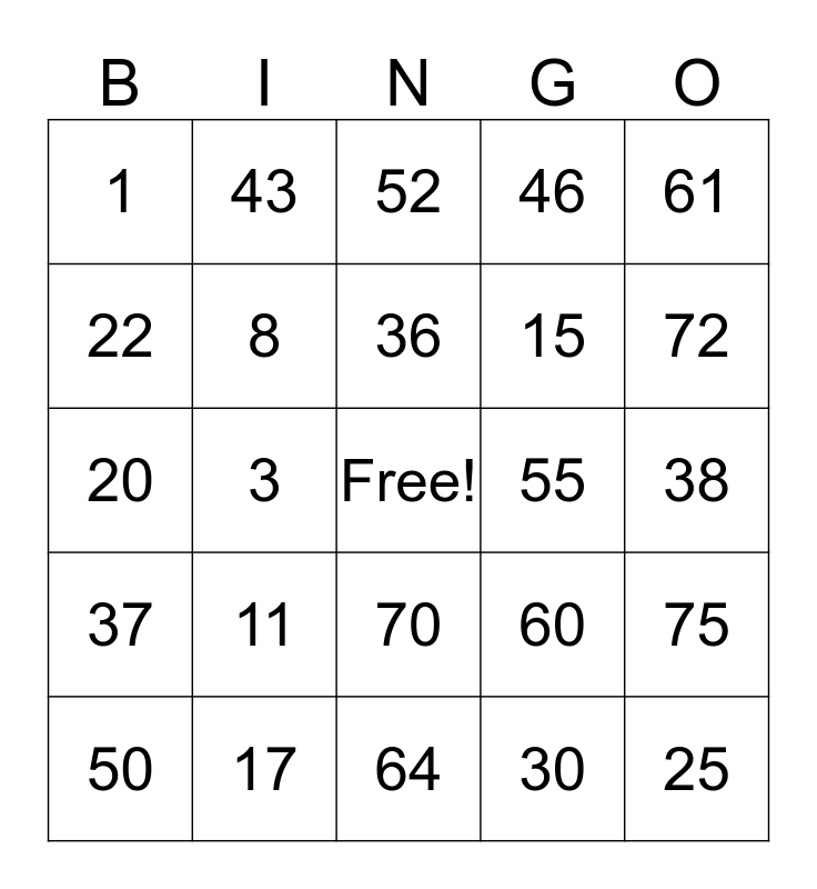 This bingo card has a free space and 24 words: 11, 17, 36, 50, 61, 1, 22, 43, 55, 70, 15, 20, 60, 75, 8, 30, 38, 52, 72, 3, 25, 37, 46 and 64.