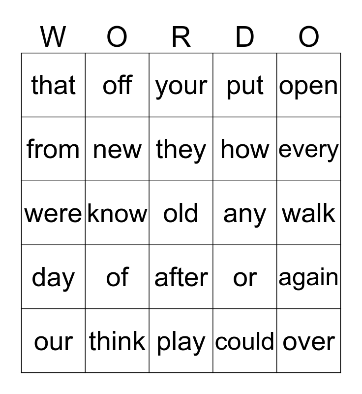 This bingo card has 25 words: of, play, they, our, open, that, from, off, any, after, how, were, or, again, new, over, walk, your, every, know, old, think, day, put and could.
