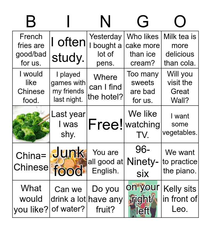 This bingo card has 5 images, a free space and 27 words: What would you like?, My favorite sport is soccer/ football., Last year I was shy., French fries are good/bad for us., Yesterday I bought a lot of pens., I played games with my friends last night., Junk food, We like watching TV., Can we drink a lot of water?, I want some vegetables., Kelly sits in front of Leo., Do you have any fruit?, on your right/ left, Will you visit the Great Wall?, Jeff is taller than Ben., You are all good at English., China= Chinese, Milk tea is more delicious than cola., 96- Ninety-six, Now we are helpful., Too many sweets are bad for us., I would like Chinese food., Who likes cake more than ice cream?, I often study., We want to practice the piano., Where can I find the hotel? and Are you tall?.