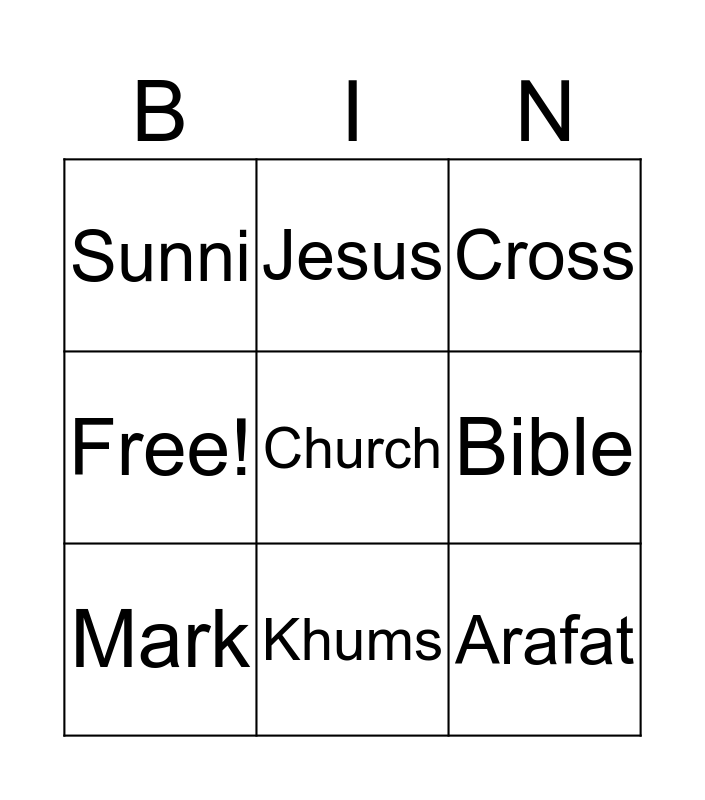 This bingo card has 13 words: Allah, Qur'an, Mark, Jesus, Free!, Church, Arafat, Hajj, Khums, Sunni, Bible, Cross and Saudi Arabia.
