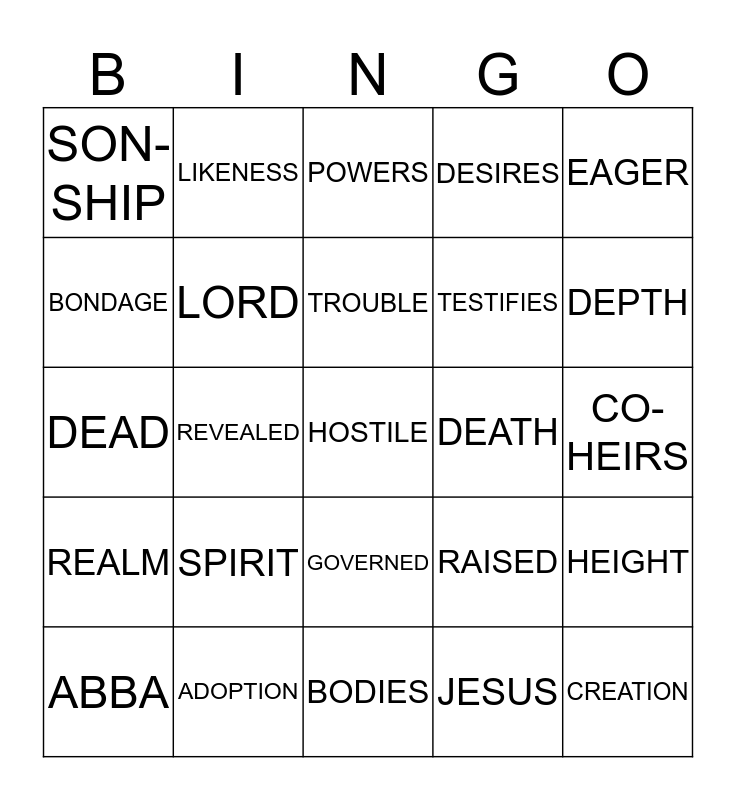 This bingo card has a free space and 24 words: SPIRIT, ADOPTION, TROUBLE, ABBA, EAGER, SON-SHIP, BONDAGE, LIKENESS, DEATH, GOVERNED, TESTIFIES, DEAD, RAISED, HEIGHT, LORD, JESUS, CO-HEIRS, POWERS, DEPTH, REVEALED, CREATION, REALM, DESIRES and BODIES.
