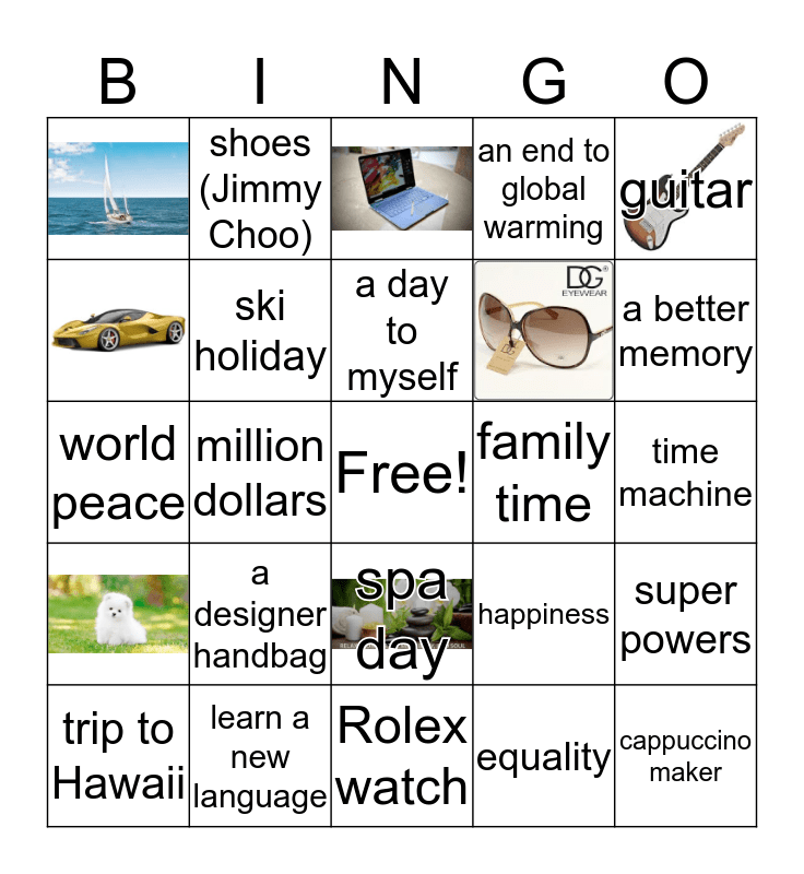 This bingo card has 12 images, a free space and 29 words: chocolate (anything), jewellery, fur coat, happiness, super powers, million dollars, family time, time machine, shoes (Jimmy Choo), health, a better memory, world peace, a designer handbag, spa day, an end to global warming, less birthdays, trip to Hawaii, ski holiday, a day to myself, equality, guitar, trip to Mars, learn a new language, Rolex watch, a personal trainer, my own chef, iPhone, cashmere sweater and cappuccino maker.