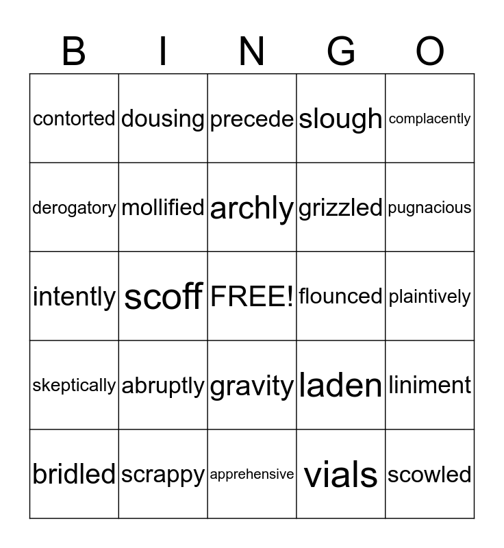 This bingo card has a free space and 25 words: abruptly, apprehensive, archly, bridled, complacently, contorted, derogatory, dousing, flounced, gravity, grizzled, intently, laden, liniment, mollified, ominously, plaintively, precede, pugnacious, scoff, scowled, scrappy, skeptically, slough and vials.