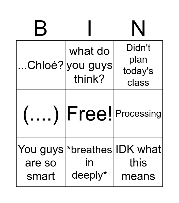 This bingo card has a free space and 8 words: Processing, Didn't plan today's class, what do you guys think?, You guys are so smart, ...Chloé?, IDK what this means, (....) and *breathes in deeply*.