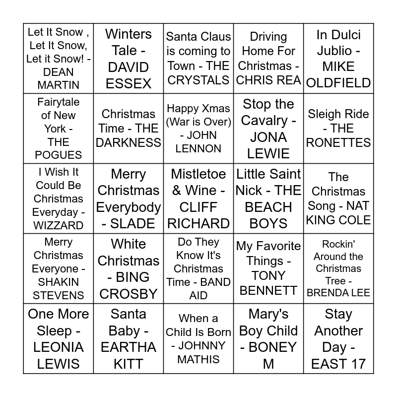 This bingo card has 35 words: All I Want For Christmas is You - MARIAH CAREY, Blue Christmas - ELVIS PRESLEY, Christmas Lights - COLDPLAY, Christmas Time - THE DARKNESS, Do They Know It's Christmas Time - BAND AID, Driving Home For Christmas - CHRIS REA, Fairytale of New York - THE POGUES, Frosty The Snowman - JACKSON 5, Happy Xmas (War is Over) - JOHN LENNON, Have yourself a Merry Little Christmas - FRANK SINATRA, I Wish It Could Be Christmas Everyday - WIZZARD, In Dulci Jublio - MIKE OLDFIELD, It's the Most Wonderful Time of the Year - ANDY WILLIAMS, Last Christmas - WHAM, Let It Snow , Let It Snow, Let it Snow! - DEAN MARTIN, Little Saint Nick - THE BEACH BOYS, Mary's Boy Child - BONEY M, Merry Christmas Everybody - SLADE, Merry Christmas Everyone - SHAKIN STEVENS, Mistletoe & Wine - CLIFF RICHARD, My Favorite Things - TONY BENNETT, One More Sleep - LEONIA LEWIS, Rockin' Around the Christmas Tree - BRENDA LEE, Santa Baby - EARTHA KITT, Santa Claus is coming to Town - THE CRYSTALS, Sleigh Ride - THE RONETTES, Stay Another Day - EAST 17, Step into Christmas - ELTON JOHN, Stop the Cavalry - JONA LEWIE, The Christmas Song - NAT KING COLE, Underneath the Tree - KELLY CLARKSON, When a Child Is Born - JOHNNY MATHIS, White Christmas - BING CROSBY, Winters Tale - DAVID ESSEX and Wonderful Christmas ime - PAUL McCARTNEY.