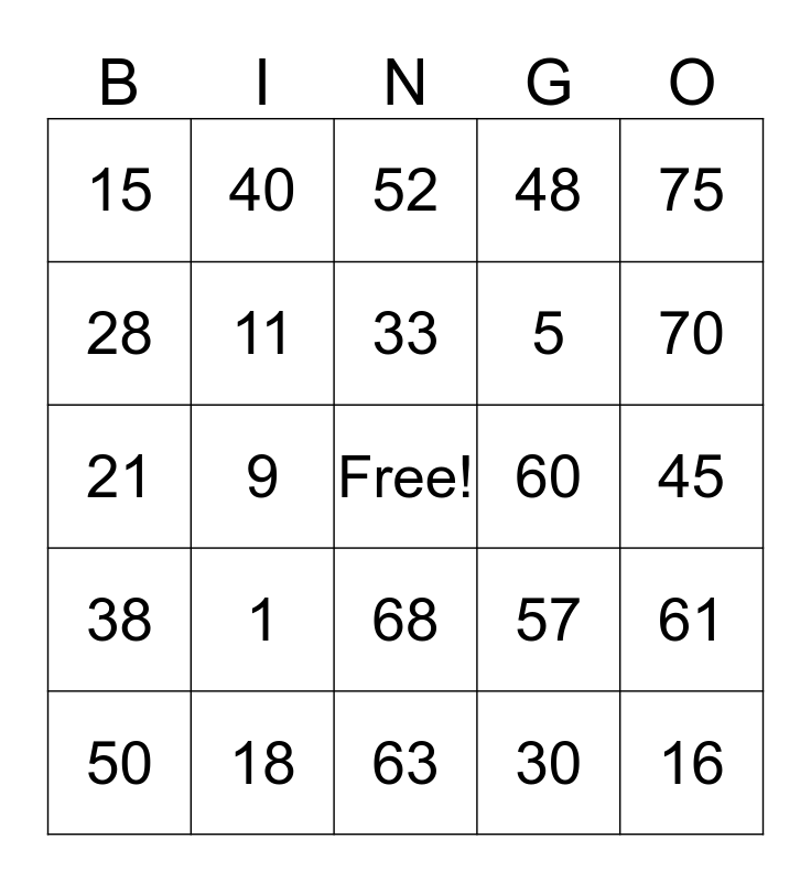 This bingo card has a free space and 24 words: 1, 18, 33, 50, 75, 15, 28, 40, 60, 68, 5, 21, 57, 61, 11, 30, 45, 52, 70, 9, 16, 38, 48 and 63.