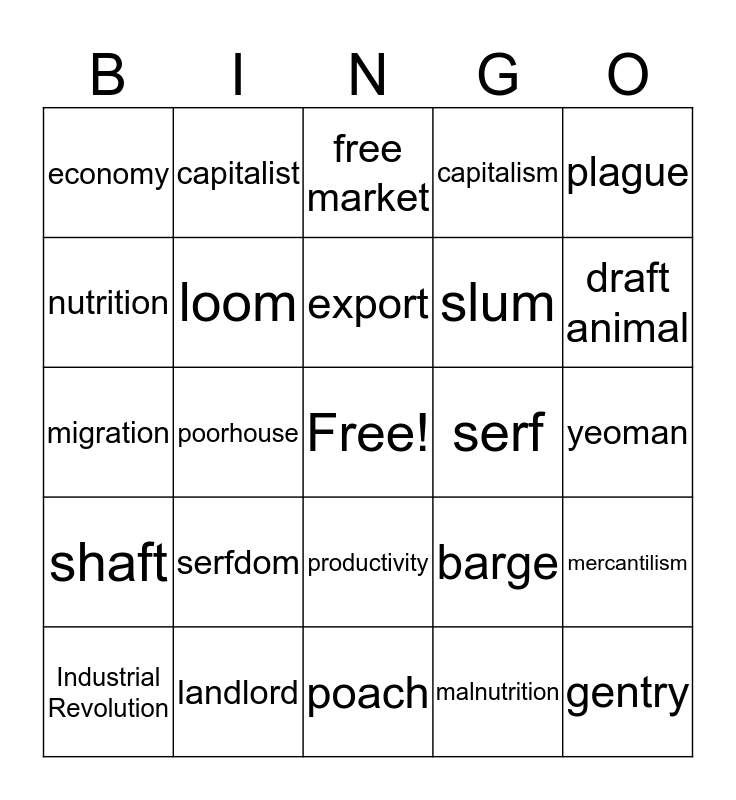 This bingo card has a free space and 29 words: Industrial Revolution, Industrialization, poorhouse, union, economy, free market, loom, serfdom, serf, landlord, yeoman, gentry, poach, malnutrition, draft animal, waterwheel, productivity, shaft, plague, migration, barge, sanitation, slum, nutrition, capitalism, capitalist, mercantilism, export and import.