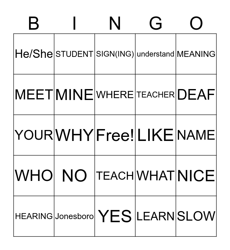 This bingo card has a free space and 24 words: NO, Jonesboro, WHERE, HEARING, MEANING, He/She, MEET, STUDENT, LIKE, TEACH, TEACHER, YOUR, WHAT, NICE, MINE, LEARN, NAME, SIGN(ING), DEAF, WHY, SLOW, WHO, understand and YES.