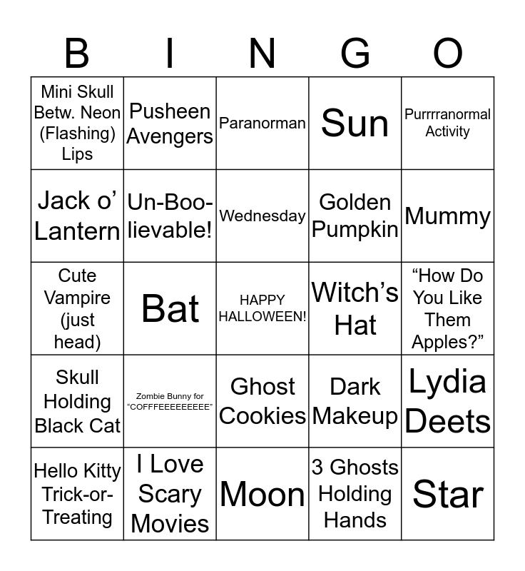 This bingo card has a free space and 34 words: Black Cat, 3 Ghosts Holding Hands, “Full of Magic” Ball, Pikachu as Deadpool & Dp as Pika, Skull Holding Black Cat, Un-Boo-lievable!, Purrrranormal Activity, Hello Kitty Trick-or-Treating, Pusheen Avengers, Dog in Costume, Wednesday, Paranorman, My Melody Masqued, Heidi Klum as WW “Thriller” + Dancers, Witch’s Hat, Mummy, I Love Scary Movies, Cute Vampire (just head), Zombie Bunny for “COFFFEEEEEEEEE”, Dark Makeup, Ghost Cookies, Stranger Things, Mini Skull Betw. Neon (Flashing) Lips, “How Do You Like Them Apples?”, Moon, Star, Sun, Starbucks GC + Tumbler or Mug, Golden Pumpkin, Jack o’ Lantern, Spider, Bat, Lydia Deets and Money Envelope.
