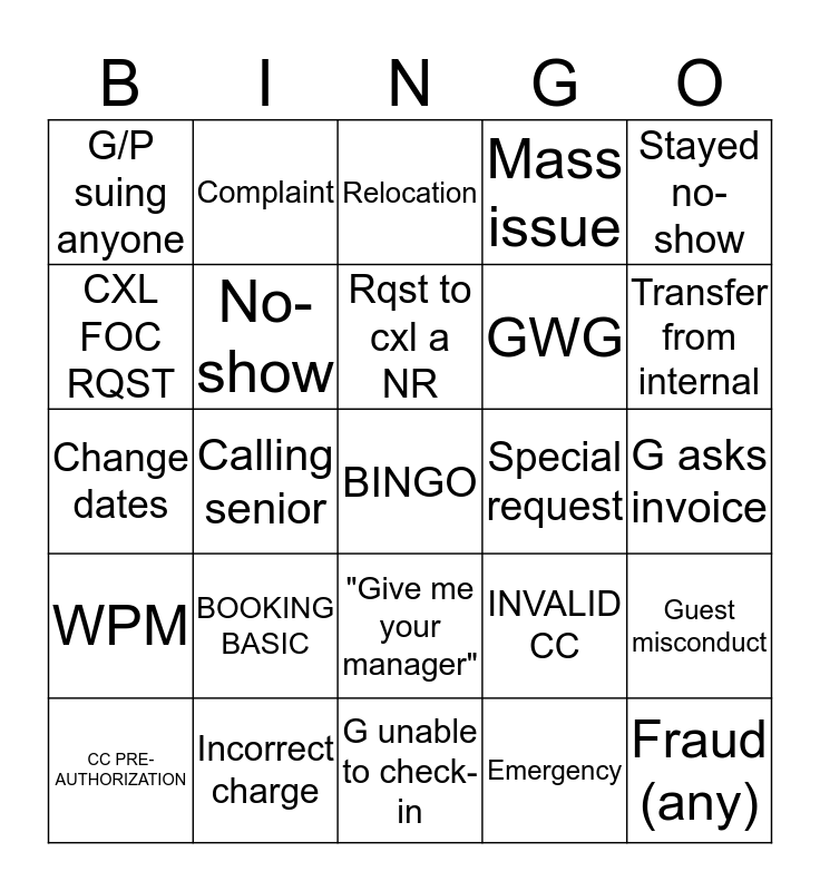 This bingo card has a free space and 24 words: BOOKING BASIC, Incorrect charge, Rqst to cxl a NR, CC PRE-AUTHORIZATION, Stayed no-show, G/P suing anyone, CXL FOC RQST, Complaint, Special request, "Give me your manager", GWG, Change dates, INVALID CC, Guest misconduct, No-show, Emergency, G asks invoice, Relocation, Transfer from internal, Calling senior, Fraud (any), WPM, Mass issue and G unable to check-in.