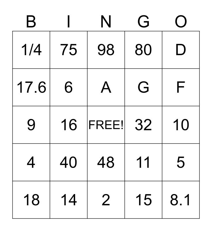 This bingo card has a free space and 24 words: 40, 14, A, 18, D, 1/4, 17.6, 75, 32, 48, G, 9, 11, 5, 6, 15, 10, 98, F, 16, 8.1, 4, 80 and 2.