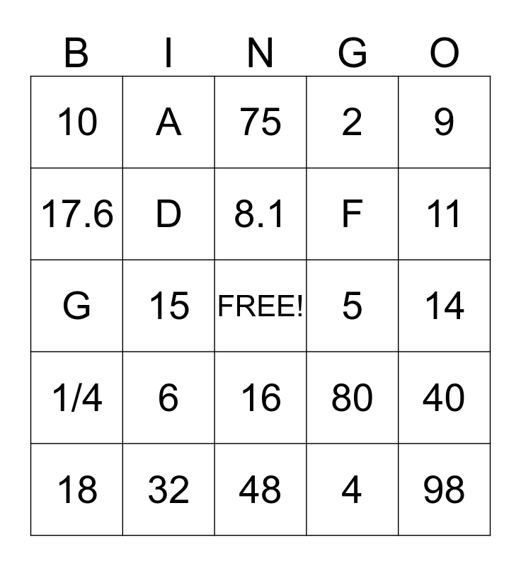 This bingo card has a free space and 24 words: 6, 32, 8.1, 18, 9, 10, 17.6, A, 5, 16, F, G, 80, 40, D, 4, 14, 75, 11, 15, 98, 1/4, 2 and 48.