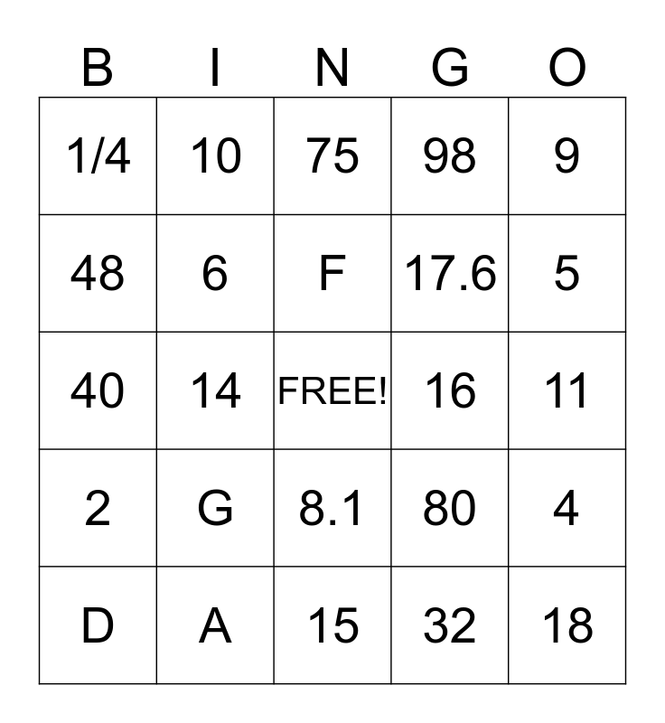 This bingo card has a free space and 24 words: G, A, F, D, 9, 1/4, 48, 10, 16, 8.1, 17.6, 40, 80, 4, 6, 32, 11, 75, 5, 14, 18, 2, 98 and 15.