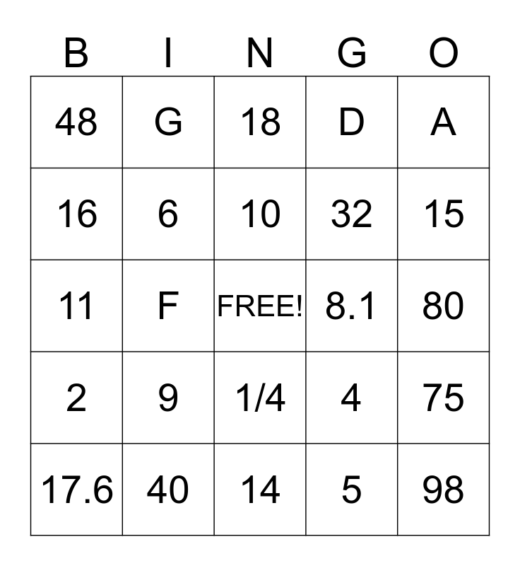 This bingo card has a free space and 24 words: 9, 40, 10, 17.6, A, 48, 16, G, 8.1, 1/4, 32, 11, 4, 75, 6, 5, 80, 18, 15, F, 98, 2, D and 14.