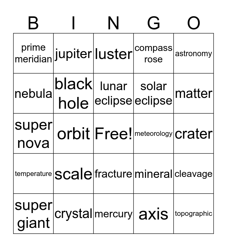This bingo card has a free space and 25 words: scale, mercury, lunar eclipse, super giant, astronomy, prime meridian, nebula, jupiter, meteorology, fracture, solar eclipse, super nova, mineral, cleavage, black hole, equator, crater, luster, matter, orbit, topographic, crystal, temperature, compass rose and axis.