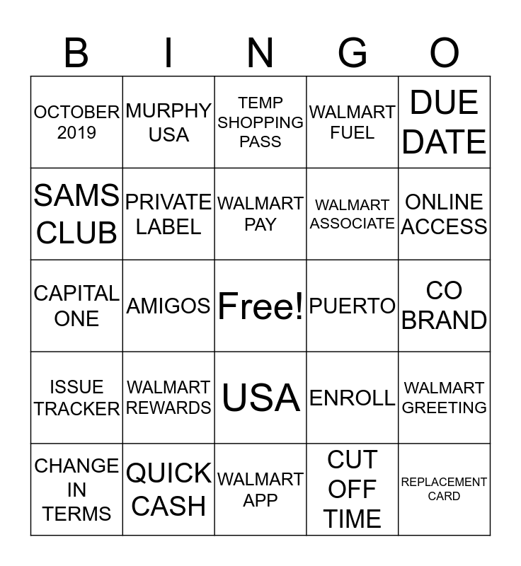 This bingo card has a free space and 24 words: WALMART REWARDS, QUICK CASH, WALMART PAY, CHANGE IN TERMS, DUE DATE, OCTOBER 2019, SAMS CLUB, MURPHY USA, PUERTO, USA, WALMART ASSOCIATE, CAPITAL ONE, ENROLL, WALMART GREETING, PRIVATE LABEL, CUT OFF TIME, CO BRAND, TEMP SHOPPING PASS, ONLINE ACCESS, AMIGOS, REPLACEMENT CARD, ISSUE TRACKER, WALMART FUEL and WALMART APP.
