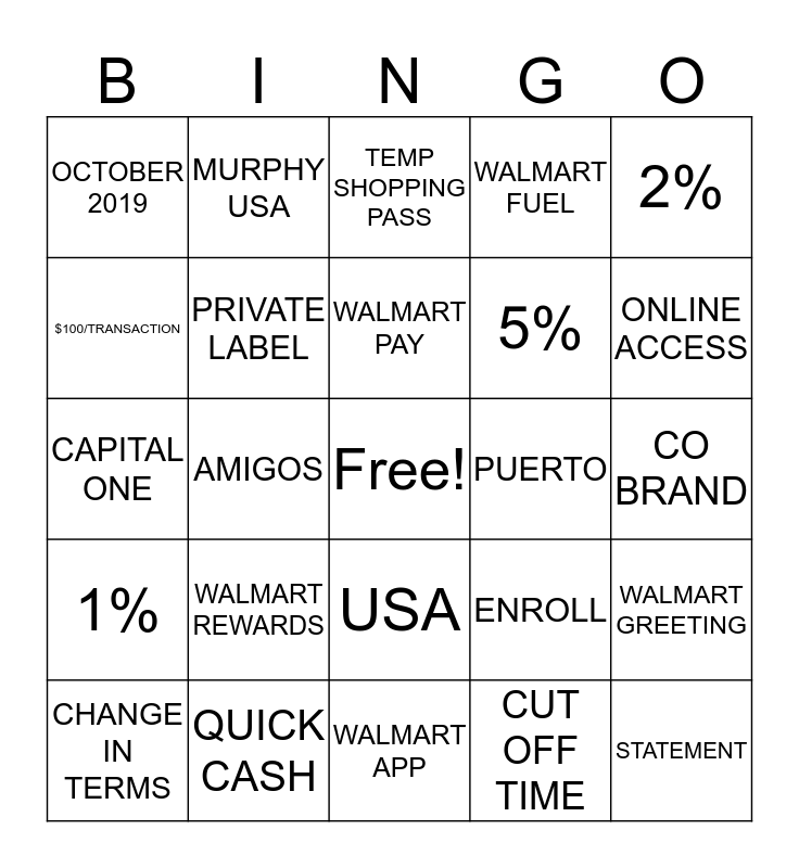 This bingo card has a free space and 24 words: WALMART REWARDS, QUICK CASH, WALMART PAY, CHANGE IN TERMS, 2%, OCTOBER 2019, $100/TRANSACTION, MURPHY USA, PUERTO, USA, 5%, CAPITAL ONE, ENROLL, WALMART GREETING, PRIVATE LABEL, CUT OFF TIME, CO BRAND, TEMP SHOPPING PASS, ONLINE ACCESS, AMIGOS, STATEMENT, 1%, WALMART FUEL and WALMART APP.