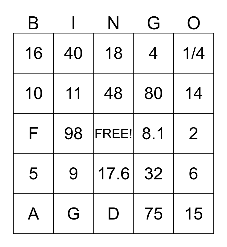 This bingo card has a free space and 24 words: 9, G, 48, A, 1/4, 16, 10, 40, 8.1, 17.6, 80, F, 32, 6, 11, 75, 2, 18, 14, 98, 15, 5, 4 and D.