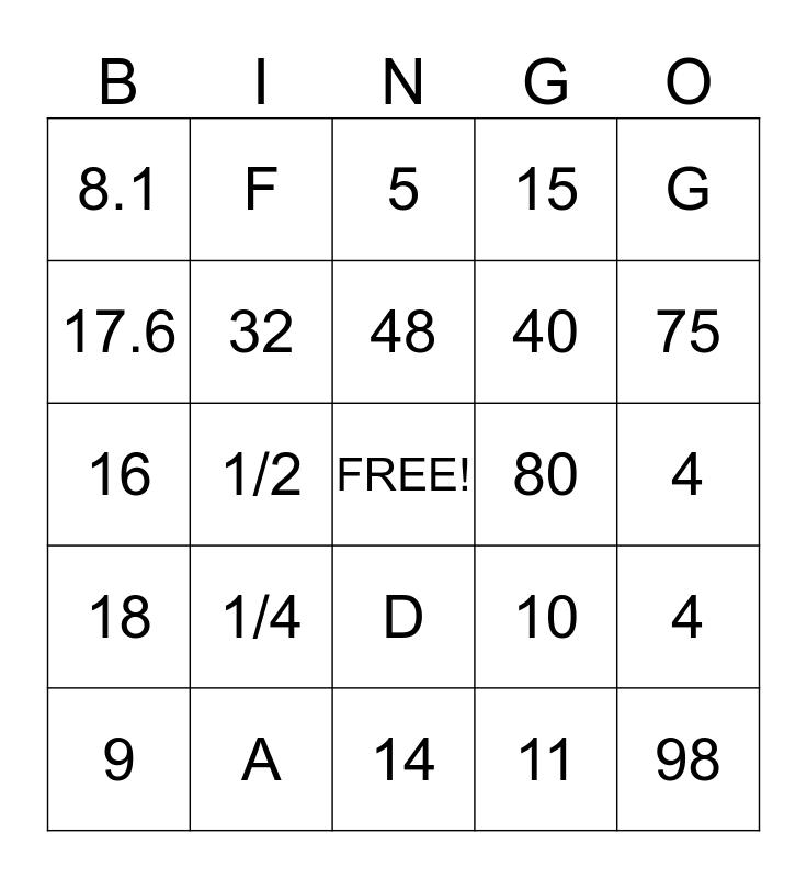 This bingo card has a free space and 24 words: 1/4, A, 48, 9, G, 8.1, 17.6, F, 80, D, 40, 16, 10, 4, 32, 11, 4, 5, 75, 1/2, 98, 18, 15 and 14.