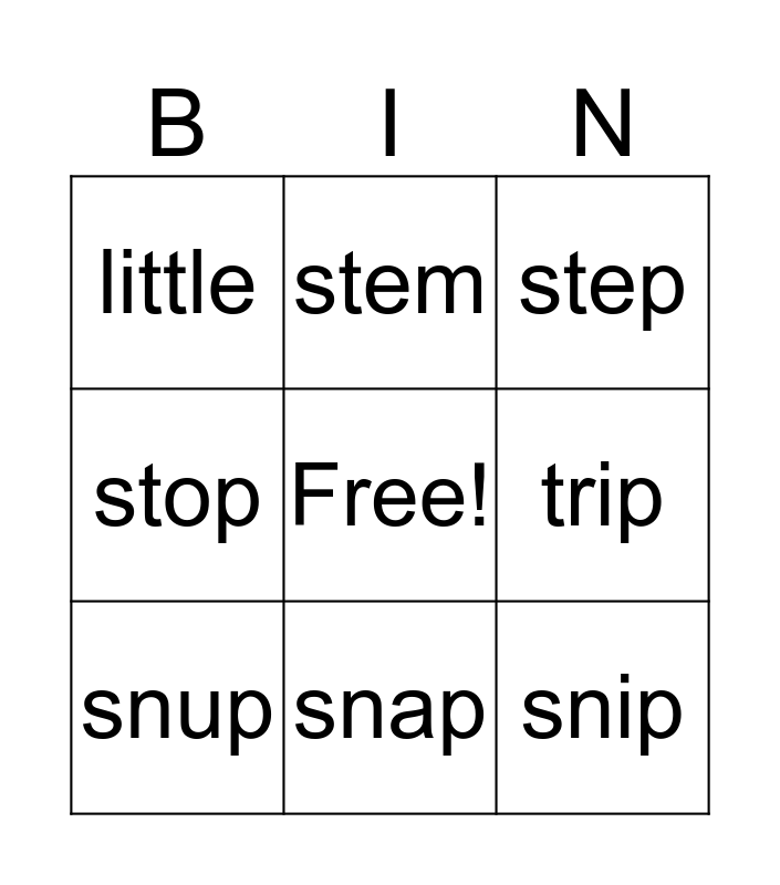 This bingo card has a free space and 11 words: my, snap, snip, snup, stem, step, stop, trap, trip, little and come.