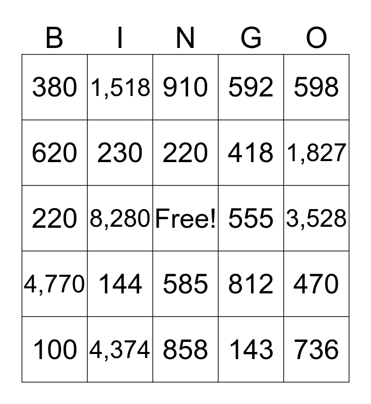 This bingo card has a free space and 24 words: 100, 144, 220, 143, 598, 380, 1,518, 910, 555, 3,528, 220, 230, 812, 470, 620, 4,374, 858, 592, 1,827, 4,770, 8,280, 585, 418 and 736.