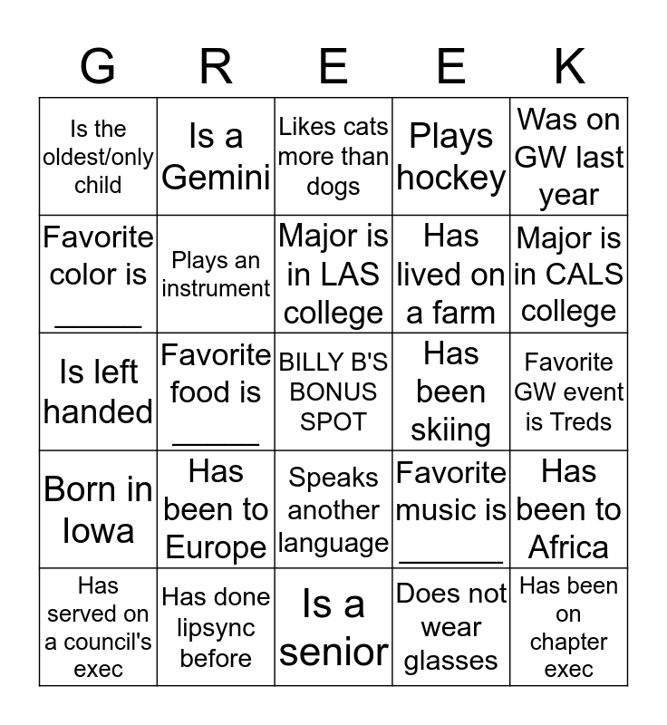 This bingo card has a free space and 24 words: Has been to Europe, Has done lipsync before, Major is in LAS college, Has served on a council's exec, Was on GW last year, Is the oldest/only child, Favorite color is _____, Is a Gemini, Has been skiing, Speaks another language, Has lived on a farm, Is left handed, Favorite music is ______, Has been to Africa, Plays an instrument, Does not wear glasses, Favorite GW event is Treds, Likes cats more than dogs, Major is in CALS college, Favorite food is _____, Has been on chapter exec, Born in Iowa, Plays hockey and Is a senior.