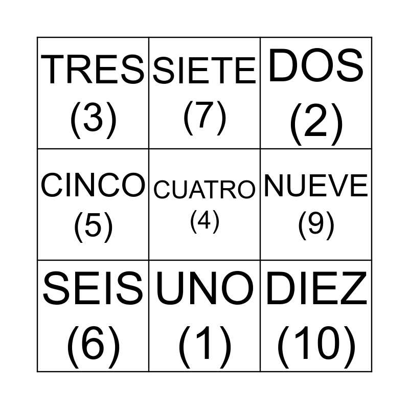 This bingo card has 10 words: UNO (1), DOS (2), TRES (3), CUATRO (4), CINCO (5), SEIS (6), SIETE (7), OCHO (8), NUEVE (9) and DIEZ (10).