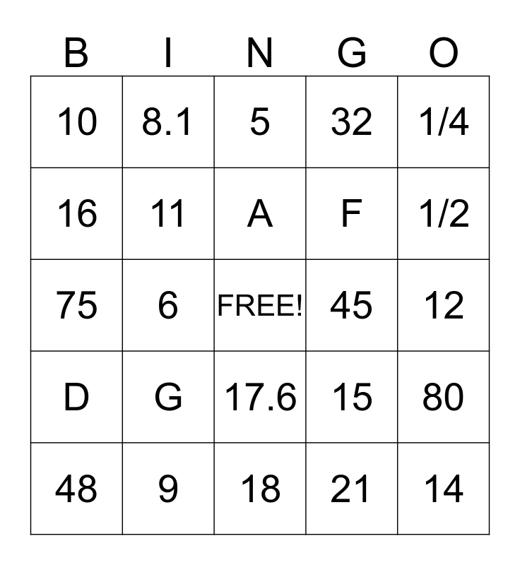 This bingo card has a free space and 24 words: G, 9, A, 48, 1/4, 10, 16, 8.1, 45, 17.6, F, 75, 15, 80, 11, 21, 12, 5, 1/2, 6, 14, D, 32 and 18.