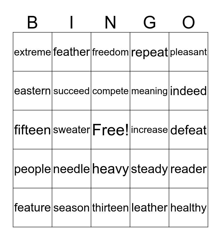 This bingo card has a free space and 24 words: needle, season, compete, feature, pleasant, extreme, eastern, feather, increase, heavy, meaning, fifteen, steady, reader, succeed, leather, defeat, freedom, indeed, sweater, healthy, people, repeat and thirteen.