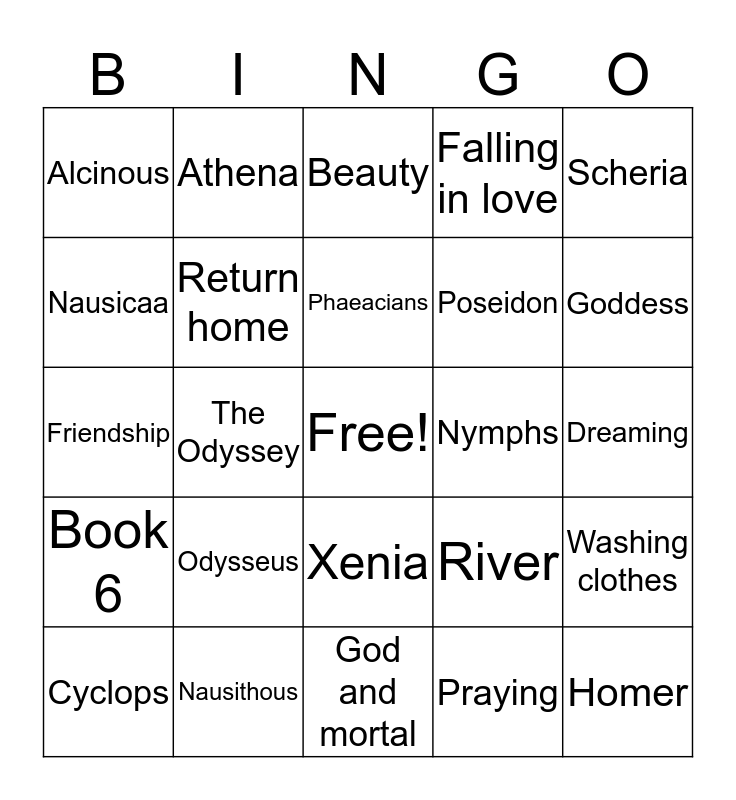 This bingo card has a free space and 24 words: Odysseus, Nausithous, Phaeacians, Cyclops, Scheria, Alcinous, Nausicaa, Athena, Nymphs, Xenia, Poseidon, Friendship, River, Washing clothes, Return home, Praying, Dreaming, Beauty, Goddess, The Odyssey, Homer, Book 6, Falling in love and God and mortal.