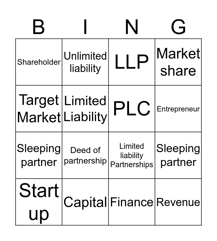 This bingo card has 25 words: Free!, Enterprise, Entrepreneur, Entrepreneurship, Target Market, Shareholder, Limited Liability, Unlimited liability, Capital, Dividend, Sleeping partner, Limited liability Partnerships, Sole trader, Partnership, PLC, LTD’s, Finance, LLP, Deed of partnership, Sleeping partner, Start up, Profit, Revenue, Market share and Stakeholder.