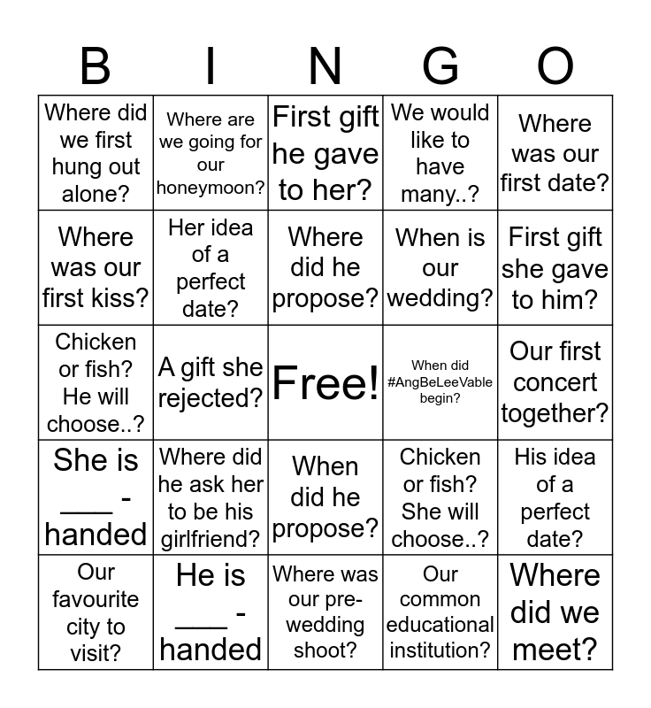 This bingo card has a free space and 25 words: Where did he ask her to be his girlfriend?, Where was our pre-wedding shoot?, Where did he propose?, Our favourite city to visit?, Where was our first date?, Where did we first hung out alone?, Where was our first kiss?, Where are we going for our honeymoon?, When did #AngBeLeeVable begin?, When did he propose?, When is our wedding?, Chicken or fish? He will choose..?, Chicken or fish? She will choose..?, His idea of a perfect date?, Her idea of a perfect date?, Our favourite activity together?, Our first concert together?, First gift he gave to her?, First gift she gave to him?, A gift she rejected?, Where did we meet?, He is ___ - handed, She is ___ - handed, We would like to have many..? and Our common educational institution?.