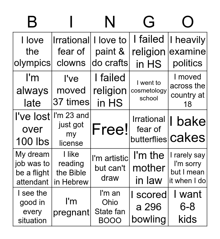 This bingo card has a free space and 24 words: I like reading the Bible in Hebrew, I'm pregnant, I failed religion in HS, I see the good in every situation, I heavily examine politics, I love the olympics, I'm always late, Irrational fear of clowns, Irrational fear of butterflies, I'm artistic but can't draw, I went to cosmetology school, I've lost over 100 lbs, I'm the mother in law, I rarely say I'm sorry but I mean it when I do, I've moved 37 times, I scored a 296 bowling, I bake cakes, I love to paint & do crafts, I moved across the country at 18, I'm 23 and just got my license, I want 6-8 kids, My dream job was to be a flight attendant, I failed religion in HS and I'm an Ohio State fan BOOO.