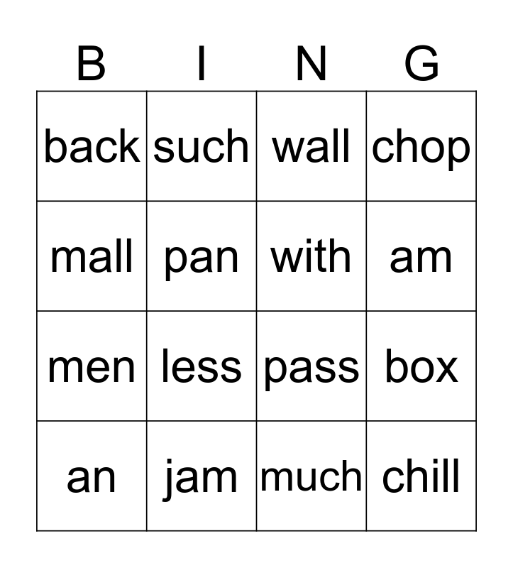 This bingo card has 24 words: van, well, am, sun, mall, back, pan, such, jam, ran, men, pass, than, fill, with, miss, much, wall, less, box, an, chill, chop and hum.