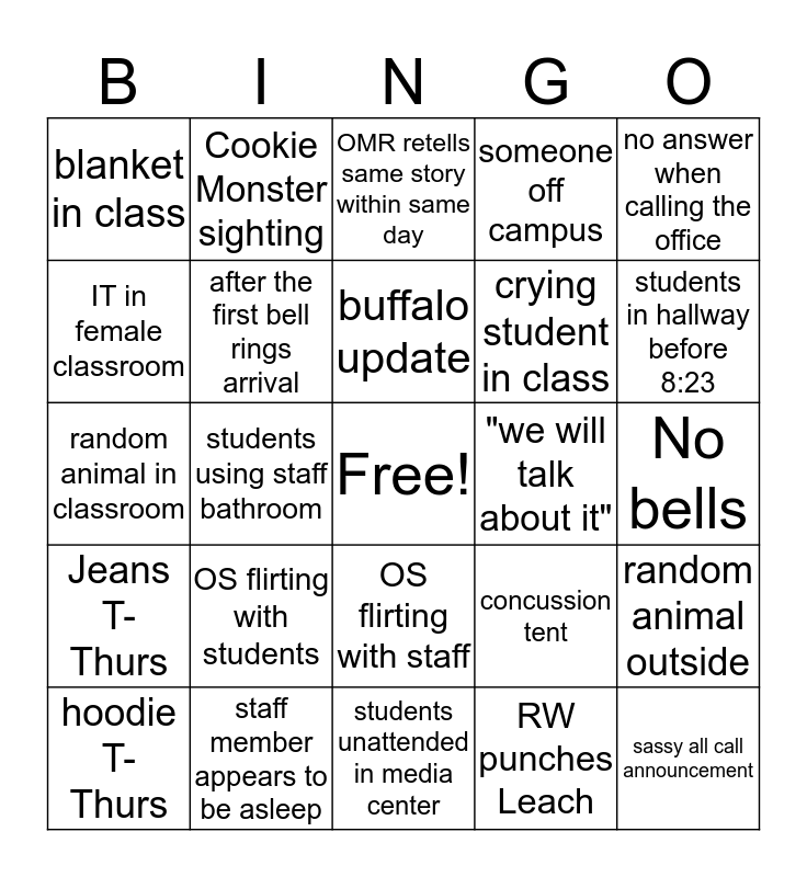 This bingo card has a free space and 39 words: 8:11 arrival, 8:15 arrival, 8:20 arrival, after the first bell rings arrival, hoodie T-Thurs, OS flirting with staff, buffalo update, bathroom blow up, no answer when calling the office, Jeans T-Thurs, students using staff bathroom, someone off campus, sassy all call announcement, No bells, "we will talk about it", OS flirting with students, seat up in bathroom, blanket in class, Bells ring, but not at the right times, concussion tent, IT in female classroom, students unattended in media center, crying student in class, students in hallway before 8:23, GB forgets a student's name, AW says the f word, simple situation is turned into chaos, students learn about Blitz Day ahead of time, Mr. K falls asleep, Cookie Monster sighting, former student on Sheriff website, Annie owes someone money, OMR retells same story within same day, staff member appears to be asleep, RW punches Leach, someone uses middle finger, random animal outside, random animal in classroom and smell in hallway.
