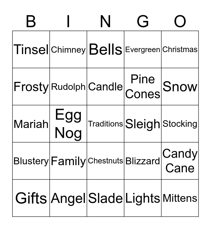 This bingo card has 61 words: Free!, Angel, Pudding, Blustery, Lights, Parties, Rudolph, Bows, Pine Cones, Fireplace, Evergreen, Holiday, Frosty, Dec. 25, Cookies, Tinsel, Traditions, Christmas, Book of Dreams, Candle, Sleigh, Bells, Gifts, Candy Cane, Poinsettia, Mistletoe, Tree, Star, Snow, Decorations, Ornaments, Reindeer, Garland, Holly, Chimney, Fruitcake, Drummer Boy, Egg Nog, Yuletide, Mariah, Santa, Family, Stocking, Wreath, Blizzard, Mince Pies, Celebration, Ribbon, Jumpers, Chestnuts, Slade, Carols, Friends, Father Christmas, Partridge, Pigs in Blankets, Yule Log, Crackers, Gingerbread, Mittens and Brussels.