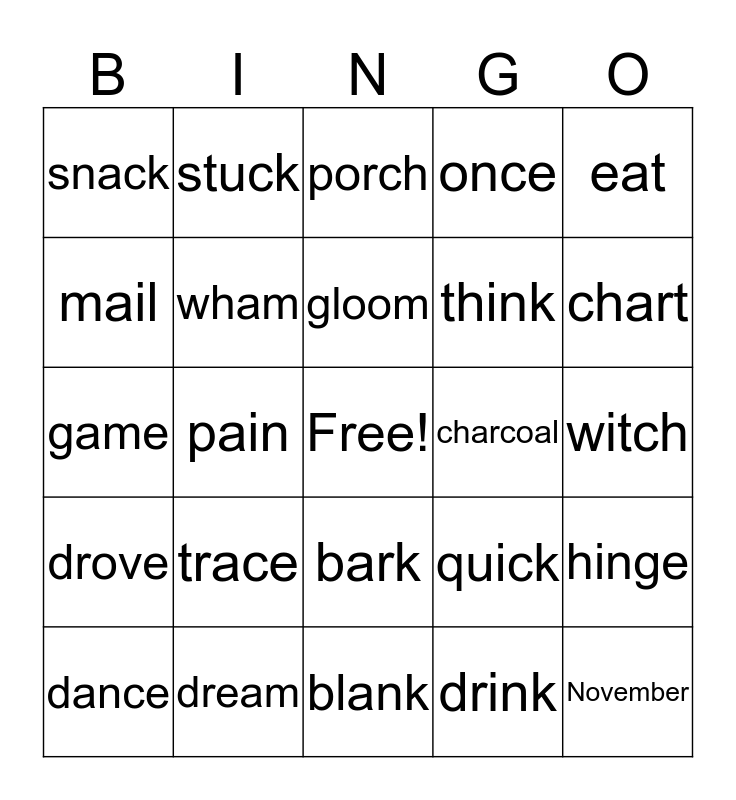 This bingo card has a free space and 132 words: thick, chop, whack, could, pointer, quake, trace, voice, charcoal, flight, couch, stage, might, brighter, brewing, year, choice, chess, thorn, cloth, what, path, once, sixth, clang, wing, blank, drink, honk, speech, wham, gloom, think, chart, broom, stay, smash, quill, sweet, snip, stuck, speck, scam, dish, swell, steel, smog, quick, sway, snack, stick, spell, scum, swish, stuff, shall, seed, mule, rope, drove, pain, trail, treat, holiday, stay, pain, drove, toast, float, mail, cupcake, bark, plunge, teacher, jawbone, lion, very, stitch, November, student, turkey, movie, stewing, hinge, holiday, might, thought, germ, cube, sight, game, crack, creep, crush, cry, peach, threw, freeze, fringe, cream, eat, dance, dream, new, read, storm, clear, grew, chew, sling, newer, reaching, meat, brew, chew, near, dear, tear, paw, claw, foam, boat, toad, porch, match, witch, pinch, ditch, itch, flower, harder and itch.