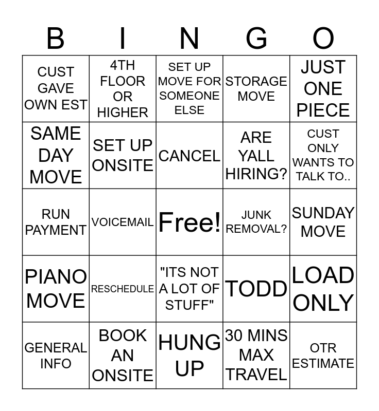 This bingo card has a free space and 24 words: RESCHEDULE, BOOK AN ONSITE, CANCEL, GENERAL INFO, JUST ONE PIECE, CUST GAVE OWN EST, SAME DAY MOVE, 4TH FLOOR OR HIGHER, JUNK REMOVAL?, "ITS NOT A LOT OF STUFF", ARE YALL HIRING?, RUN PAYMENT, TODD, LOAD ONLY, SET UP ONSITE, 30 MINS MAX TRAVEL, SUNDAY MOVE, SET UP MOVE FOR SOMEONE ELSE, CUST ONLY WANTS TO TALK TO.., VOICEMAIL, OTR ESTIMATE, PIANO MOVE, STORAGE MOVE and HUNG UP.