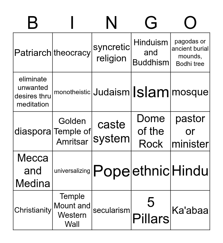 This bingo card has a free space and 24 words: universalizing, Temple Mount and Western Wall, Judaism, Christianity, pagodas or ancient burial mounds, Bodhi tree, Patriarch, eliminate unwanted desires thru meditation, theocracy, Dome of the Rock, Pope, Islam, diaspora, ethnic, Hindu, monotheistic, 5 Pillars, pastor or minister, syncretic religion, mosque, Golden Temple of Amritsar, Ka'abaa, Mecca and Medina, Hinduism and Buddhism and secularism.