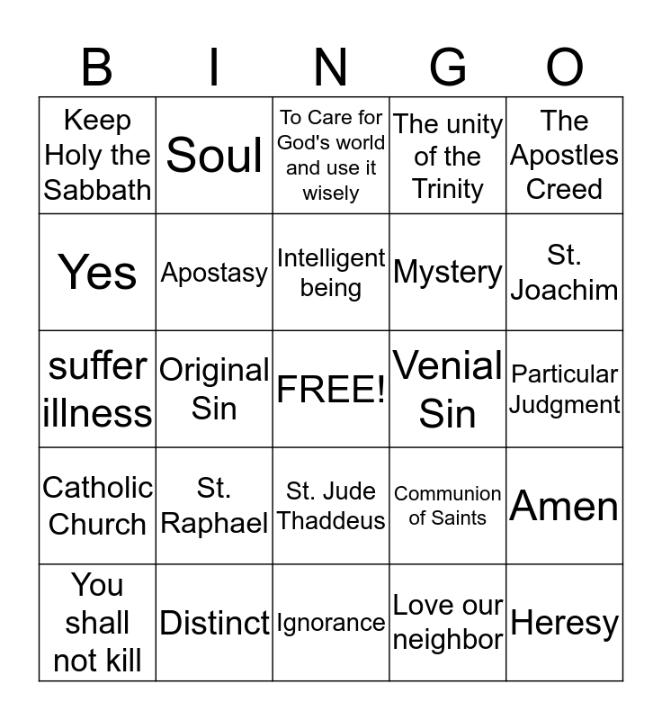This bingo card has a free space and 44 words: Voluntary doubt, Heresy, Honor your mother and father, You shall not kill, Love God, Love our neighbor, To Care for God's world and use it wisely, Because he made them from nothing, The Apostles Creed, Distinct, The unity of the Trinity, Venial Sin, St. Jude Thaddeus, St. Raphael, Hannukah, Ignorance, Removed Grace, suffer illness, St. Anne, St. Joachim, Soul, Body and Soul, Shall not steal, Keep Holy the Sabbath, Ten, Particular Judgment, Assumption, Eucharist, Communion of Saints, Catholic Church, God, Amen, Mortal Sin, Abraham, Original Sin, Hammer, Grace, St. Maxamillion Kolbe, Intelligent being, Yes, Mystery, No, Apostasy and Incredulity.