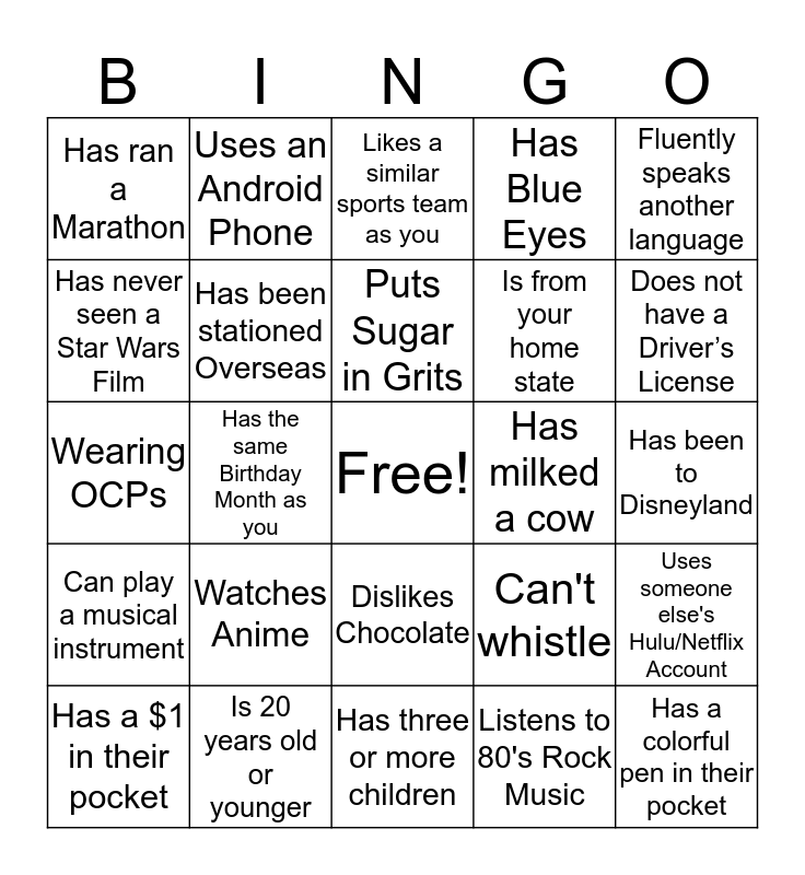 This bingo card has a free space and 29 words: Has a $1 in their pocket, Has never seen Game of Thrones, Has the same Birthday Month as you, Has a Challenge Coin, Has ran a Marathon, Likes a similar sports team as you, Has been stationed Overseas, Watches Anime, Has milked a cow, Is 20 years old or younger, Has been to Disneyland, Has a colorful pen in their pocket, Has three or more children, Listens to 80's Rock Music, Does not have a Driver’s License, Is Vegetarian/Vegan, Dislikes Chocolate, Can play a musical instrument, Fluently speaks another language, Wearing OCPs, Can't whistle, Calls carbonated drinks "Pop", Is from your home state, Has never seen a Star Wars Film, Has Blue Eyes, Uses an Android Phone, Uses someone else's Hulu/Netflix Account, Puts Sugar in Grits and Has done Honor Guard.