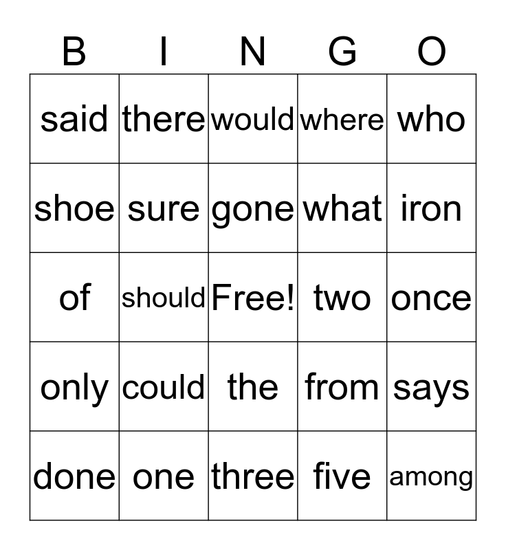 This bingo card has a free space and 29 words: done, they, should, four, said, would, sure, could, two, one, once, among, three, five, iron, triple, the, only, who, of, from, does, what, shoe, where, there, says, gone and were.