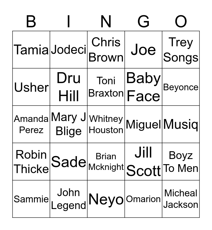 This bingo card has a free space and 50 words: Free!, Micheal Jackson, Brandy, Neyo, Sade, Tyrese, Jodeci, Drake, Usher, Rihanna, Dru Hill, Joe, Boyz To Men, Jill Scott, Mariah Carey, Bobby Brown, Toni Braxton, Miguel, Erykah Badu, Trey Songs, Mary J Blige, Omarion, Tamia, Baby Face, Anita Baker, Luther Vandross, Beyonce, Aaliyah, Chris Brown, Brian Mcknight, Alicia Keys, Kci & Jojo, The Weekend, T-Pain, John Legend, Ginuwine, Tank, Tevin Campbell, Justin Timberlake, Musiq, Frank Ocean, HER, Maxwell, Mario, Sammie, Amanda Perez, Ruben Studdard, Monica, Robin Thicke and Johnny Gill.